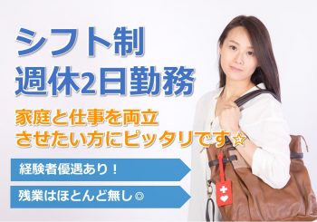 | 勤務時間 | シフト制 8:45~17:30(日勤) 7:15~16:00(早出) 10:30~19:15(遅出) 各休憩1時間 17:00~翌9:00(夜勤)(休憩2時間) |